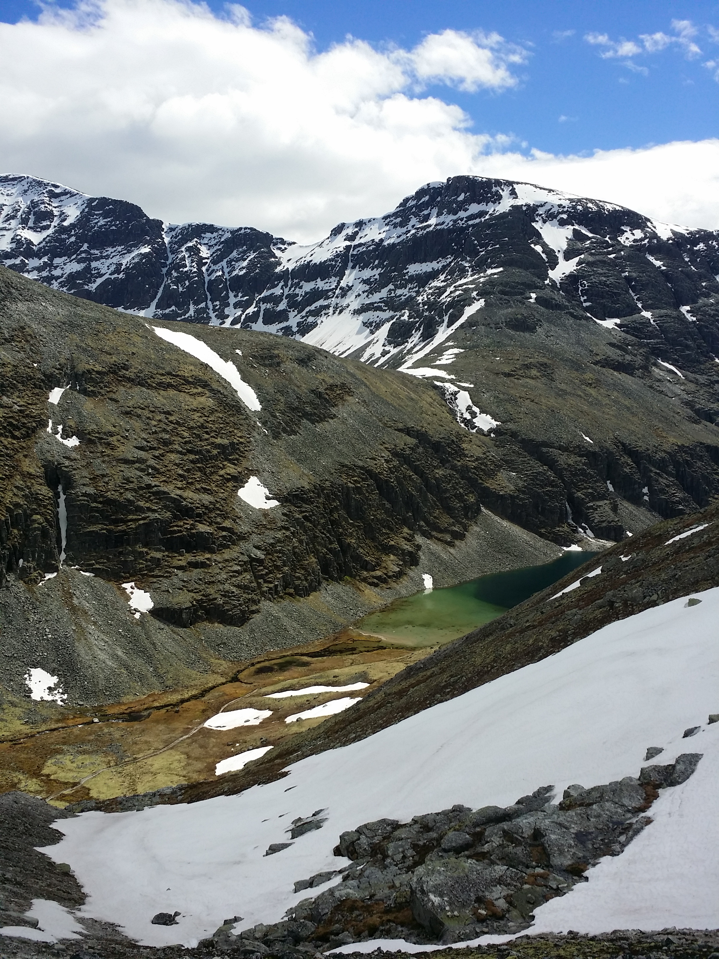 Etter at sekken og skoene var snøret sammen, begynte vi på turen mot Dørålseter. Første delen går over Rondhalsen (1647 moh.) her ser man ned på Rondvatnet, utsikten gjør at man virkelig glede seg til fortsettelsen. Stien deler seg når man nærmer seg toppen, her kan man ta turen videre opp på Veslesmeden (2015 moh.), men grunnet mye snø mot toppen valgte vi å fortsette ned i Rondvassdalen mot Bergdalstjønnin.